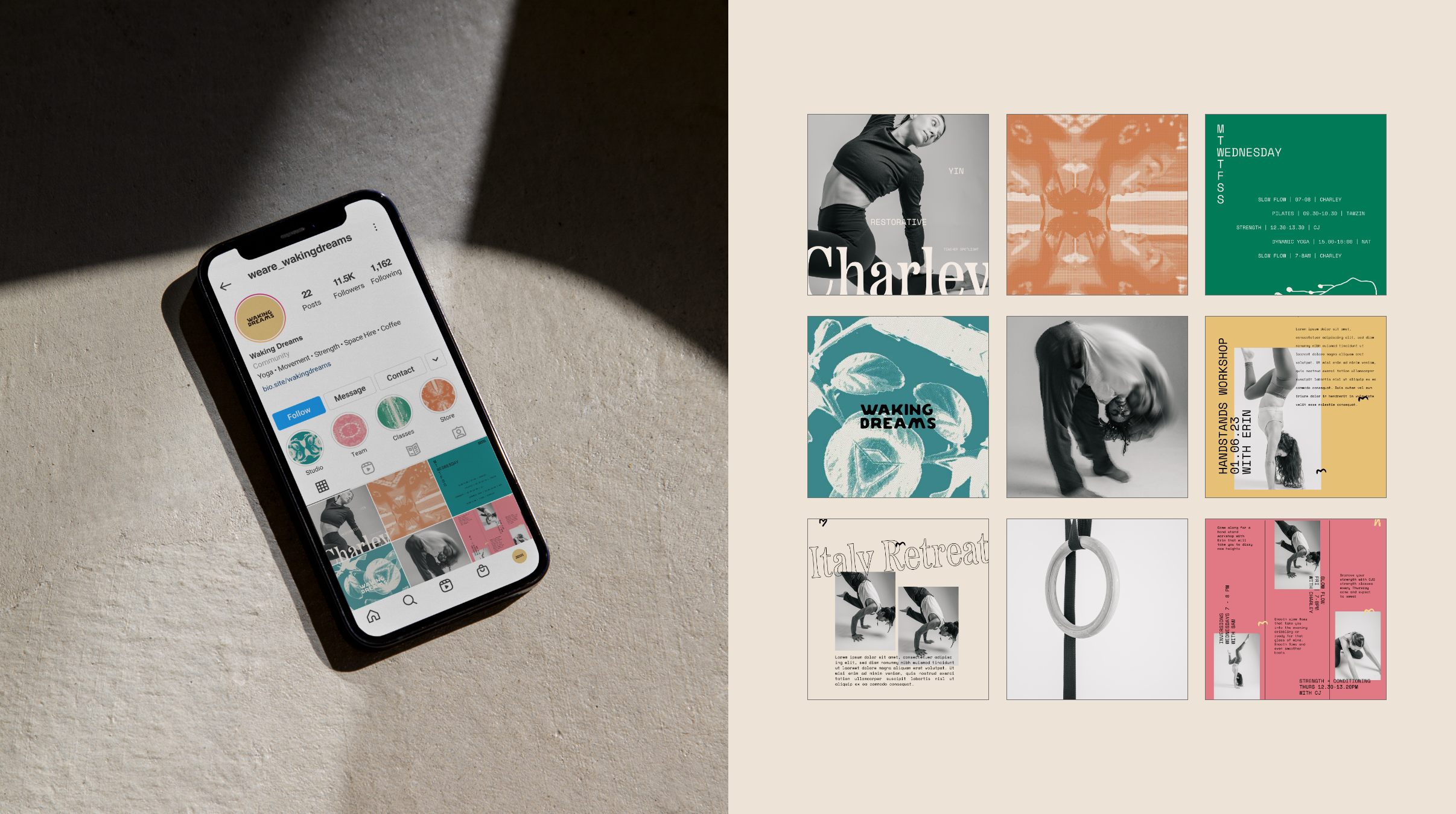 We worked with yoga, movement and events hire studio Waking Dreams to help them bring their physical and digital presence to life and represent what they stood for as a business. We worked across digital, physical and brand collateral to create an identity that was considered, progressive, not your typical yoga studio but that also didnβt take itself to seriously and left room open for whimsy and fun.